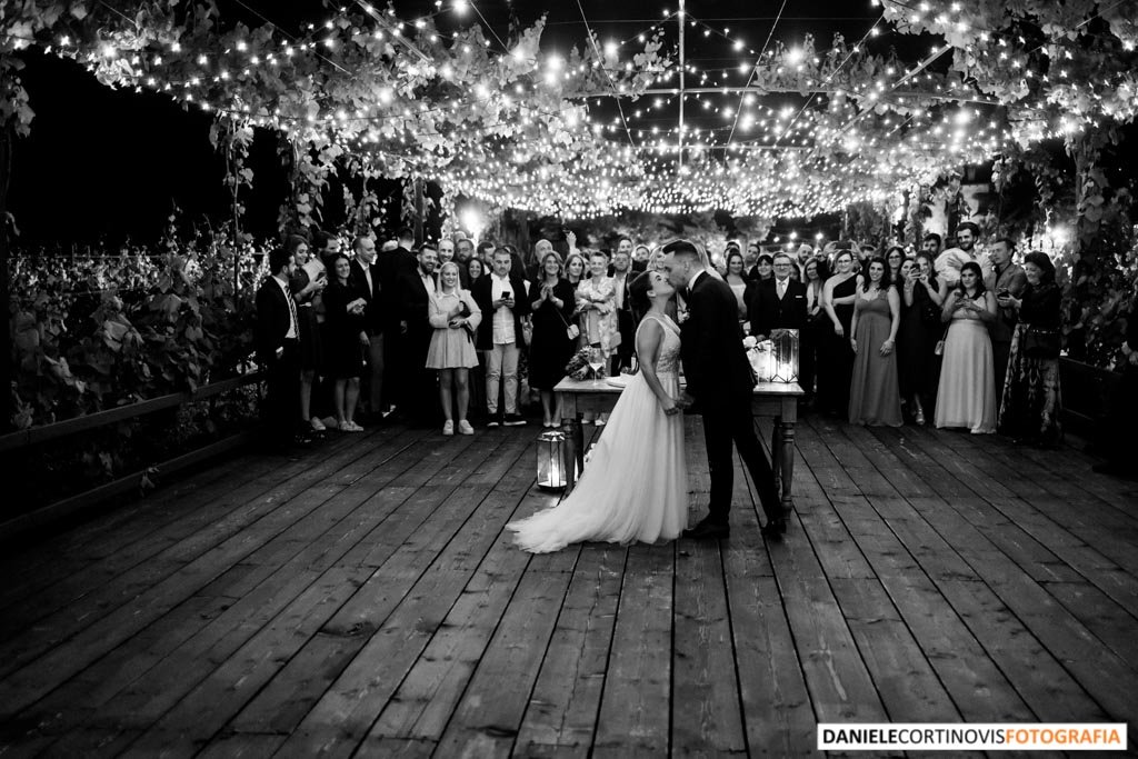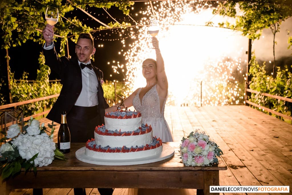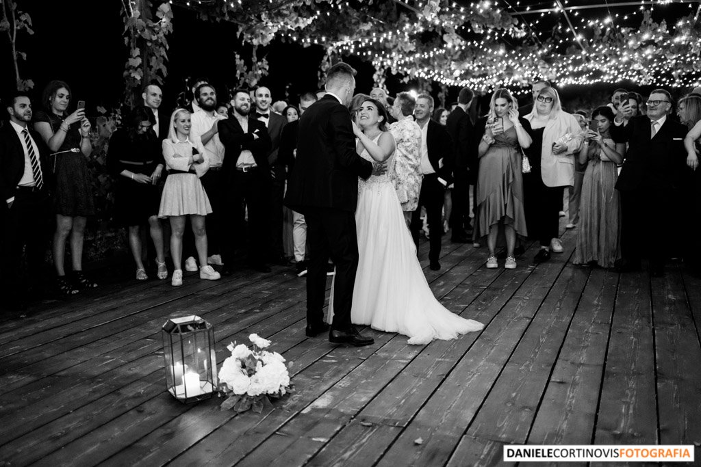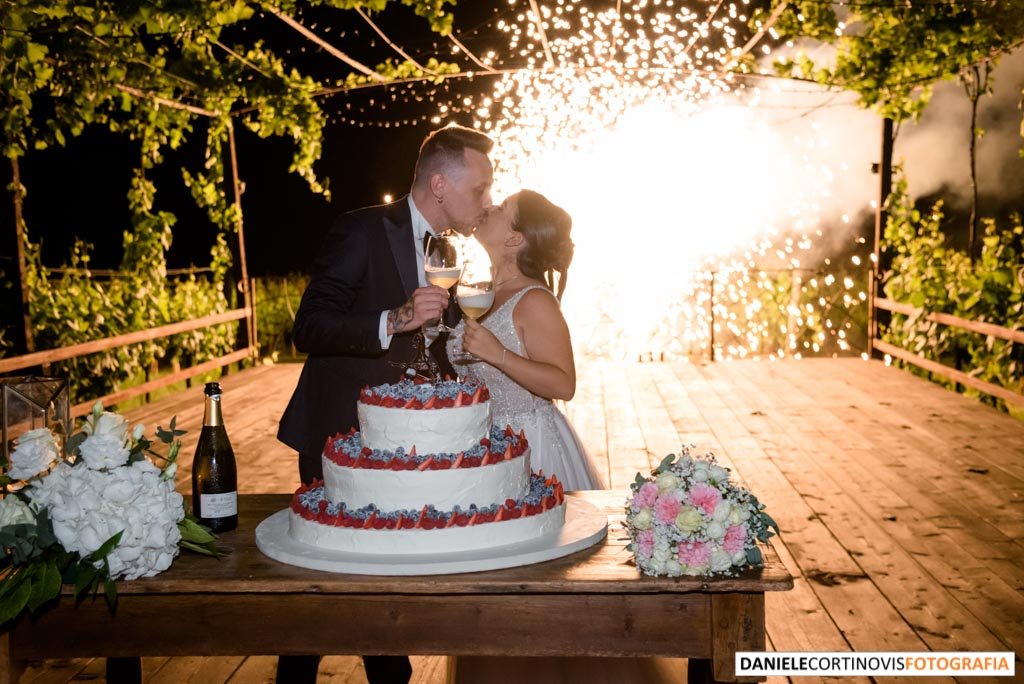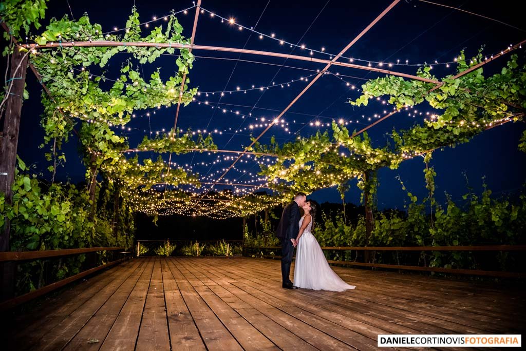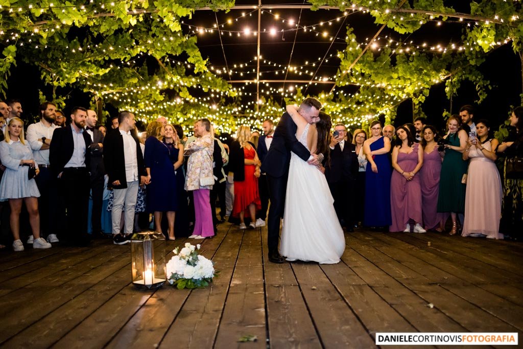 Dopo il taglio torta sulla pedana immersa nelle vigne gli sposi hanno fatto il loro primo ballo e successivamente il lancio del bouquet.