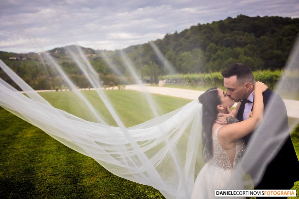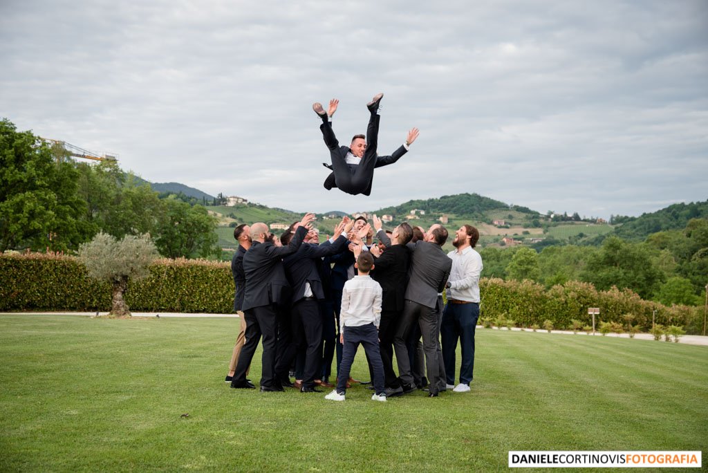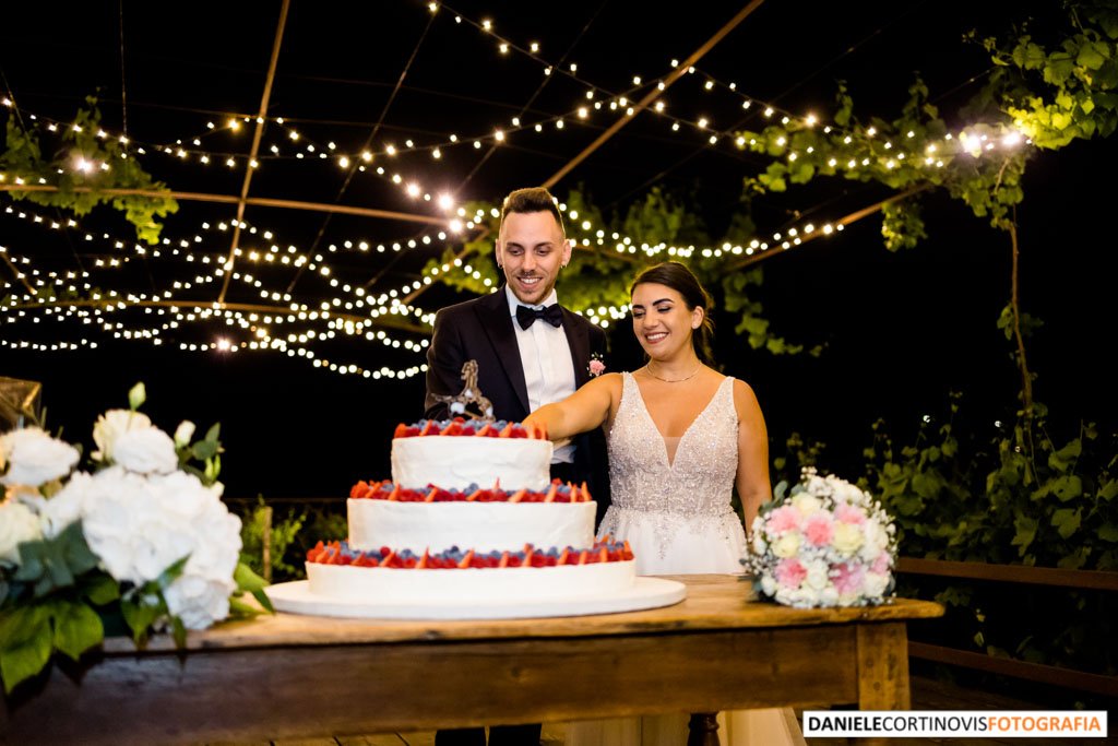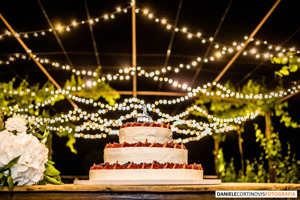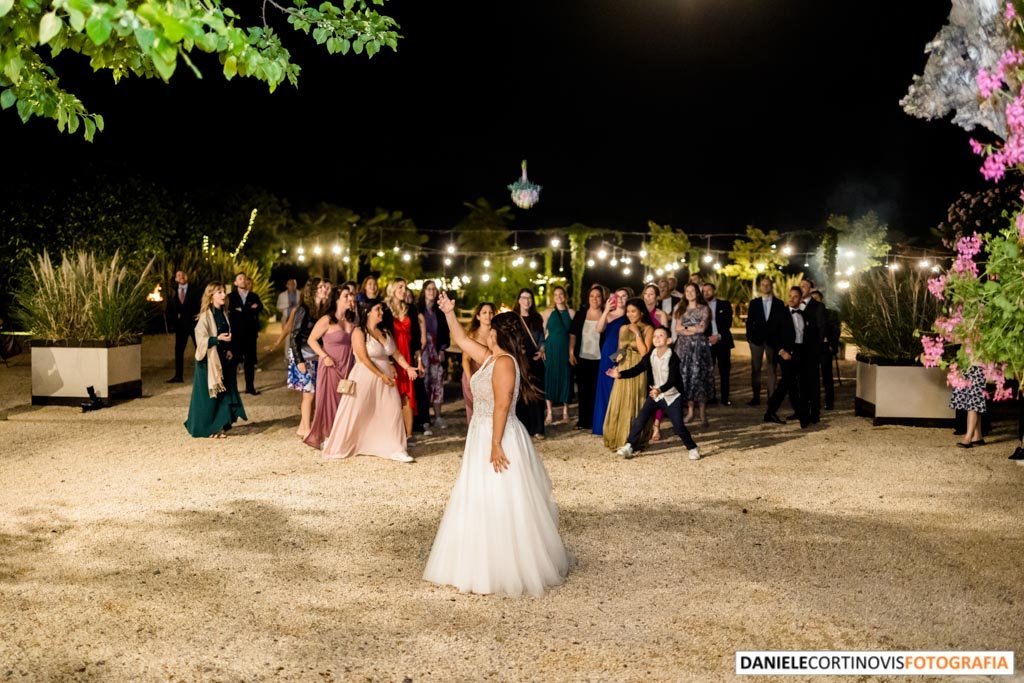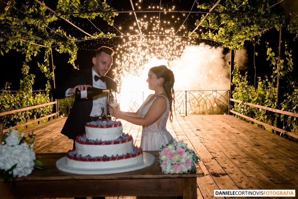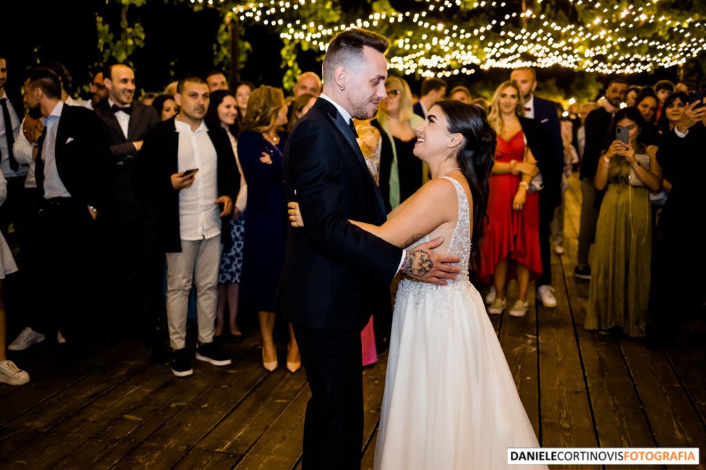 Dopo il taglio torta sulla pedana immersa nelle vigne gli sposi hanno fatto il loro primo ballo e successivamente il lancio del bouquet.