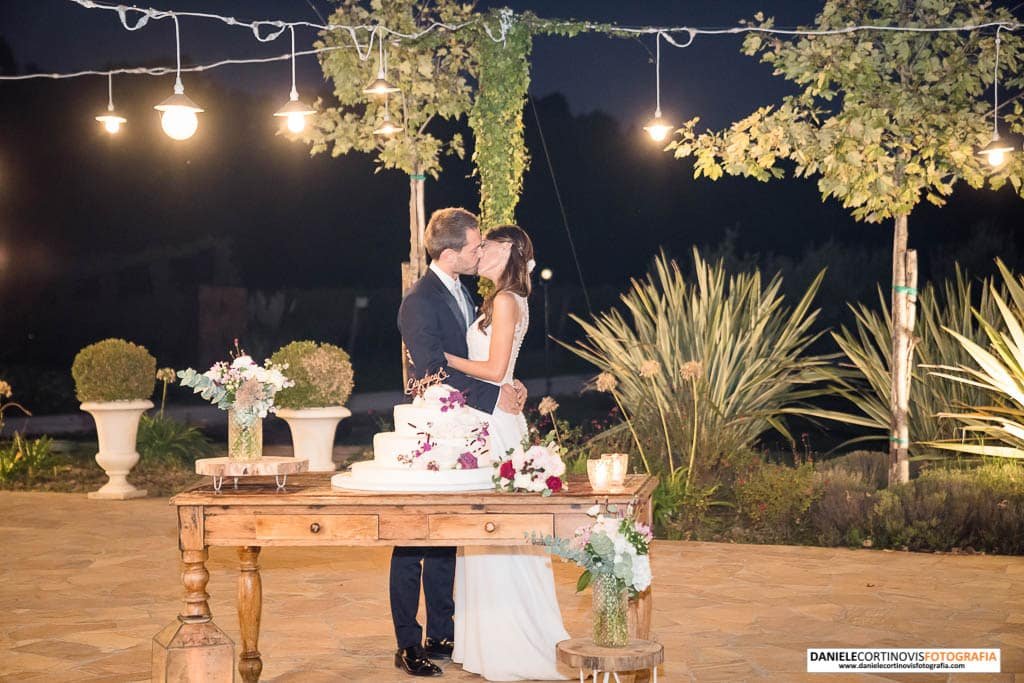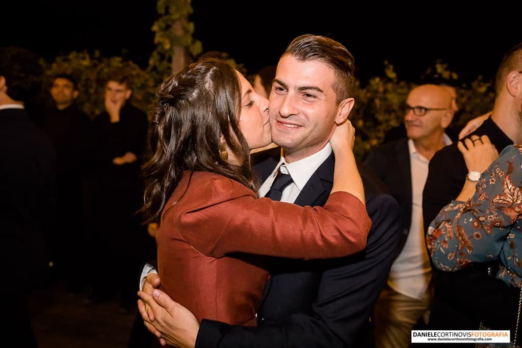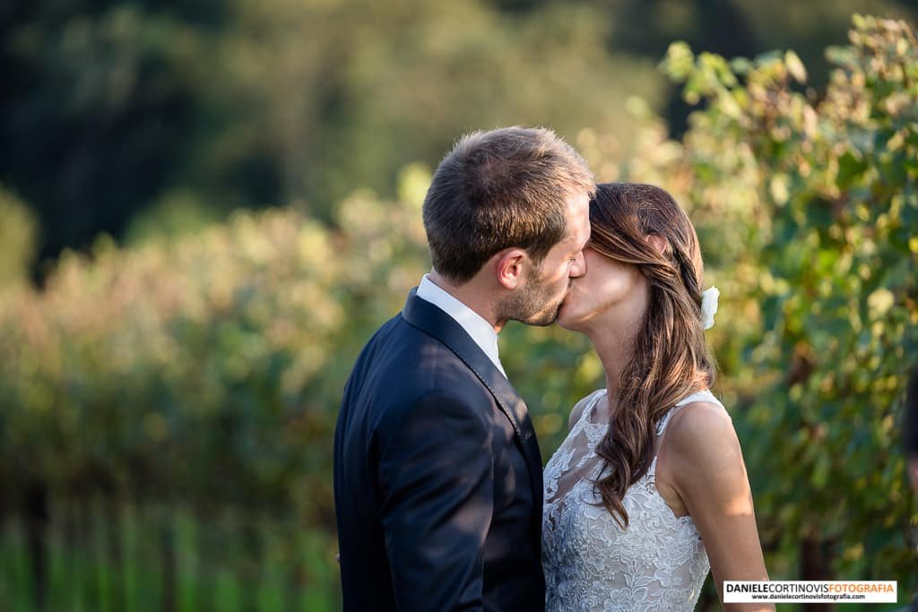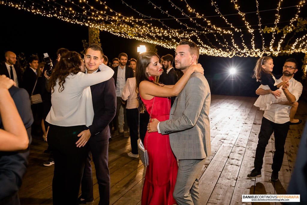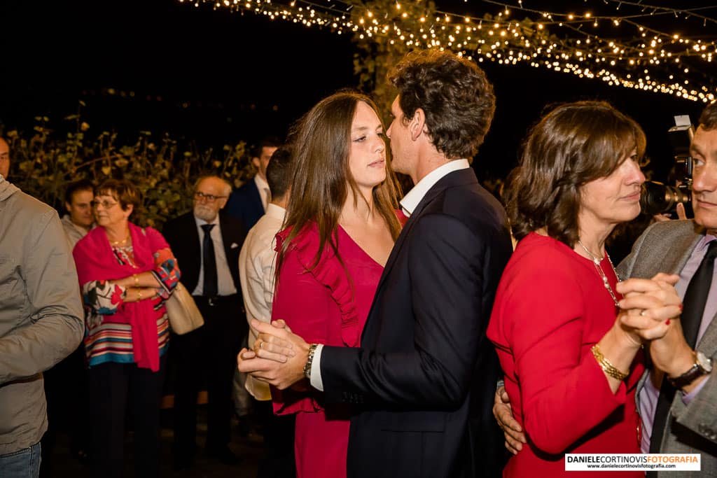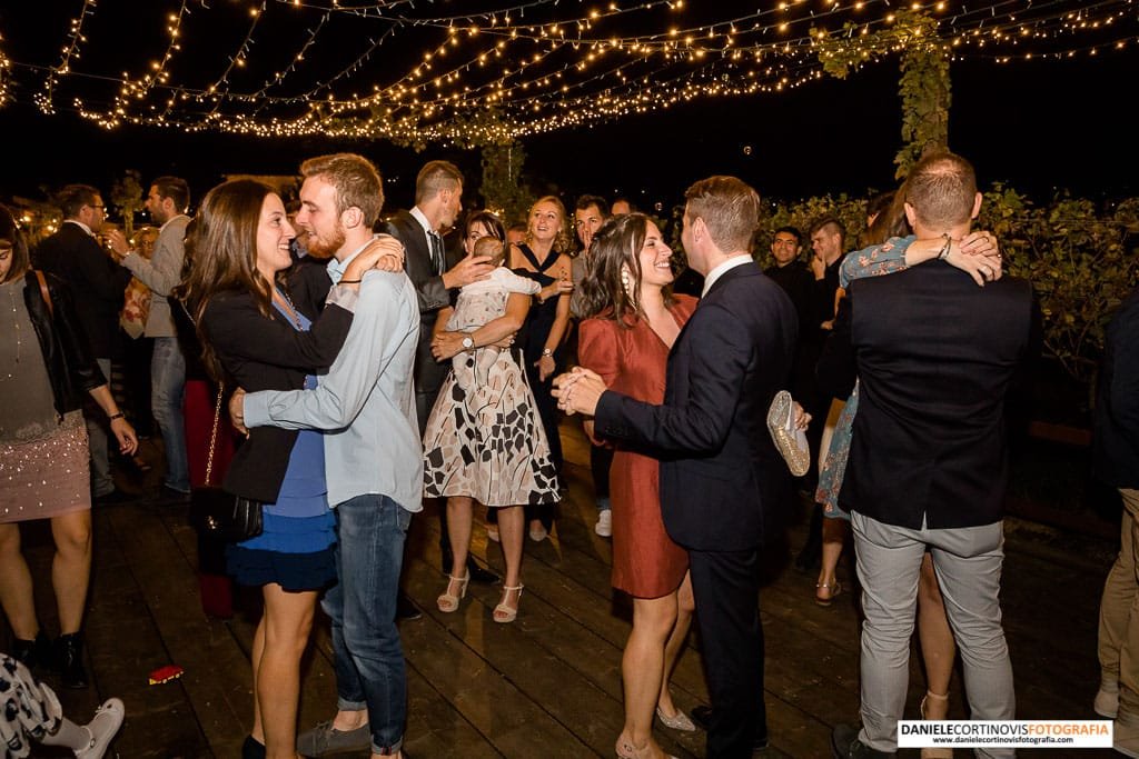Al momento della torta un lungo corridoio formato dagli amici e parenti ha accompagnato gli sposi che, stappata la bottiglia, si è diretta verso il palchetto in mezzo alle vigne dove hanno ballato la loro canzone.