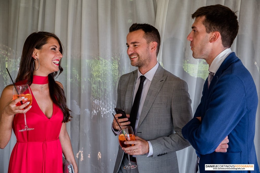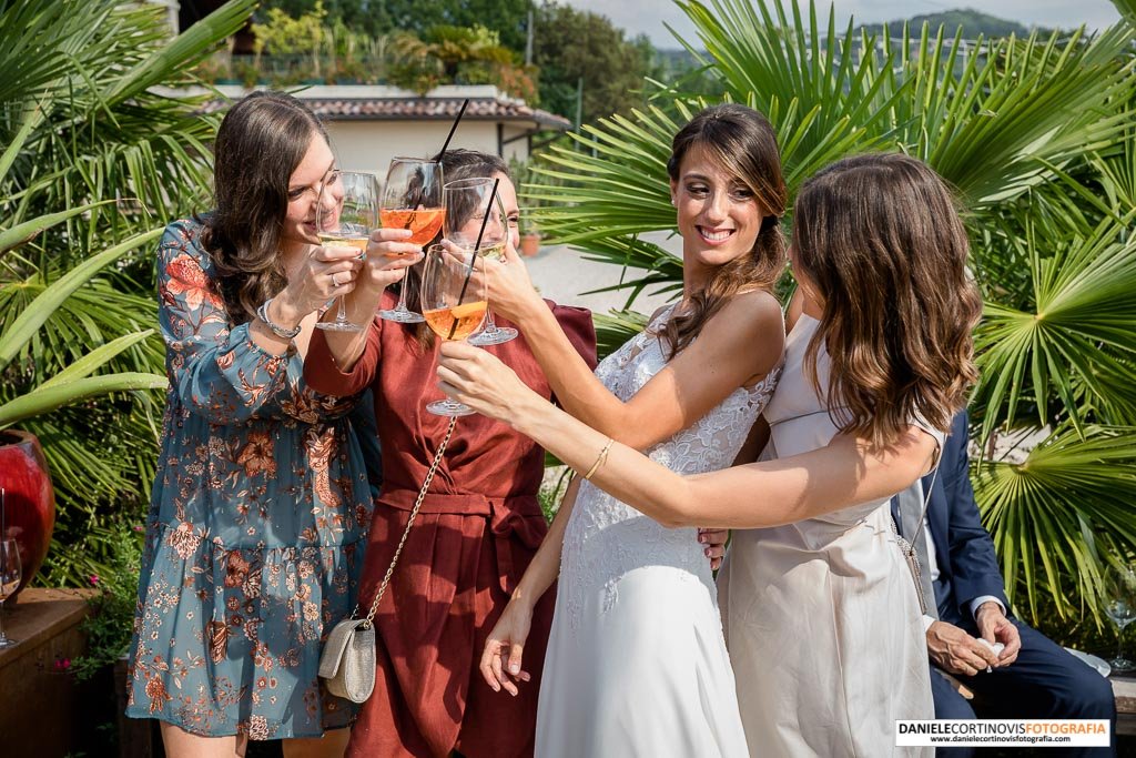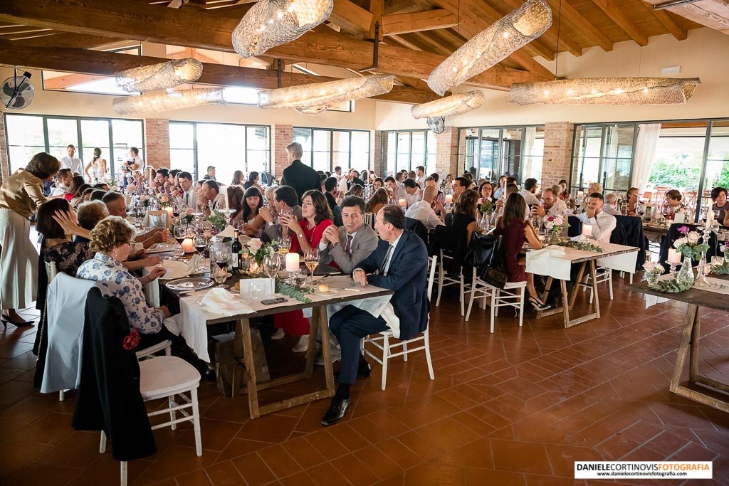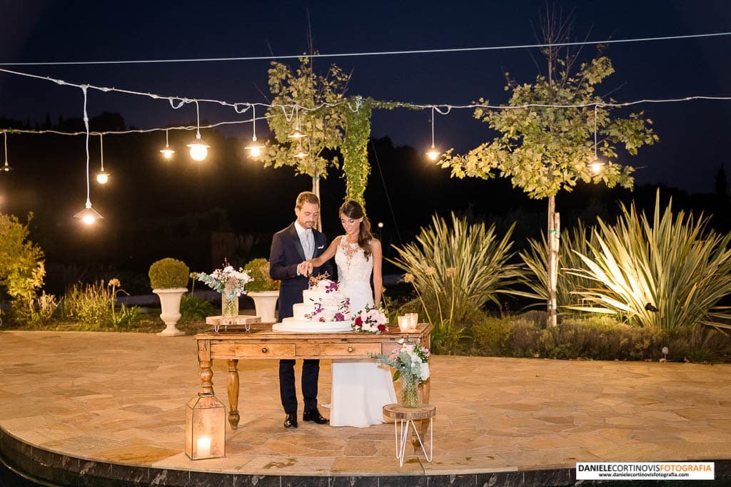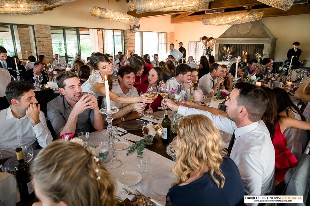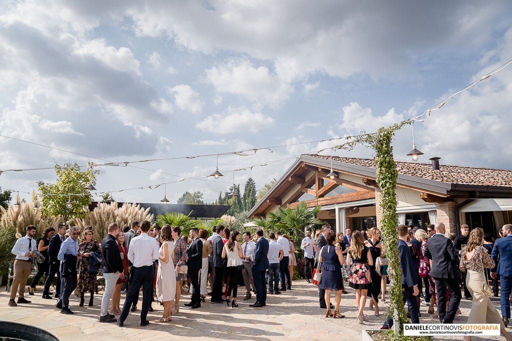 Al momento della torta un lungo corridoio formato dagli amici e parenti ha accompagnato gli sposi che, stappata la bottiglia, si è diretta verso il palchetto in mezzo alle vigne dove hanno ballato la loro canzone.