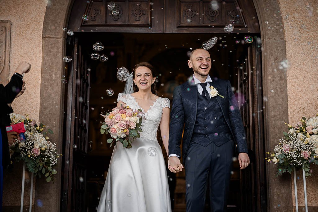 Dopo il loro si eterno, al termine della cerimonia, gli sposi sono stati accolti al suo esterno con bolle di sapone e tanta tanta gioia.