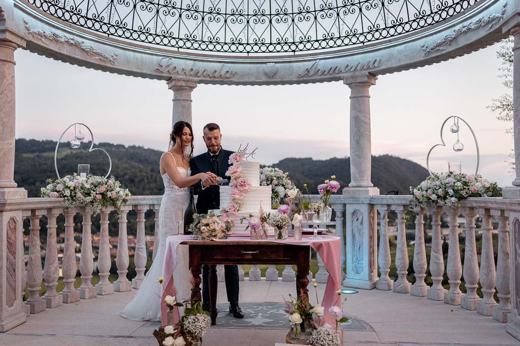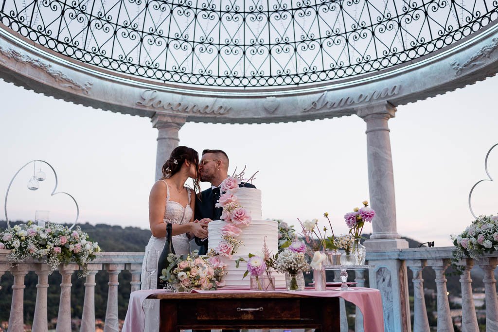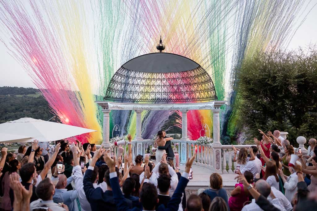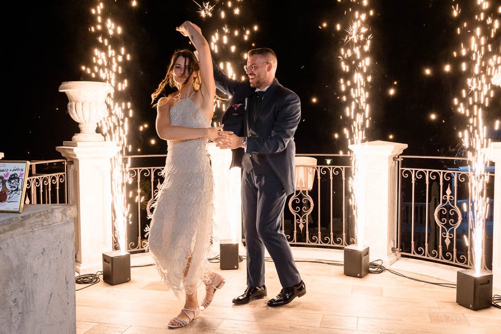 Il momento del taglio della torta è stato uno dei più attesi: gli sposi, circondati da amici e parenti, hanno brindato al loro futuro con una torta scenografica posizionata sotto la cupola esterna della location, un momento illuminato da decine di scintille.