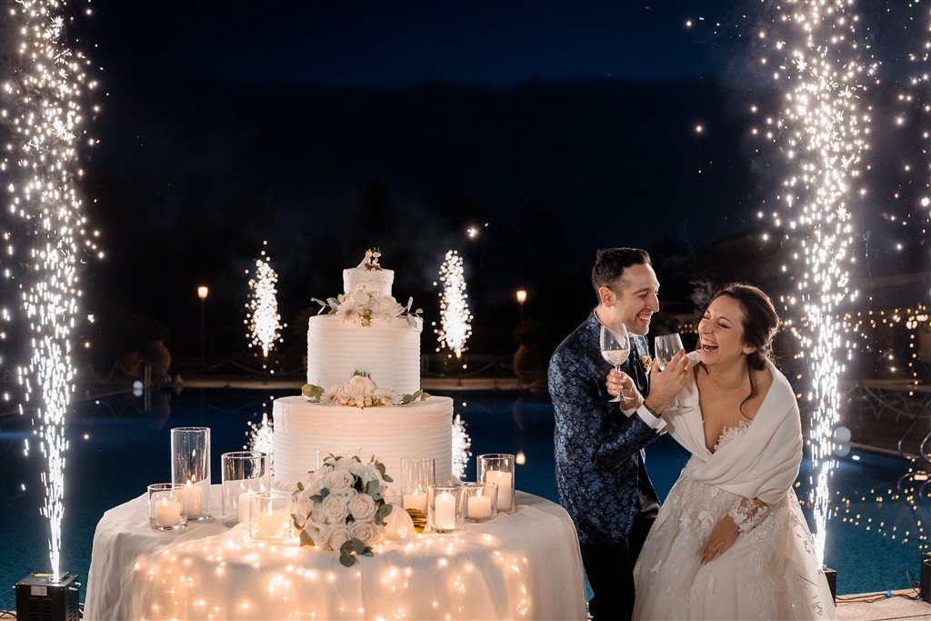Un bellissimo e fiabesco momento è stato il taglio della torta in piscina, con le sue fontane e i braceri accesi.