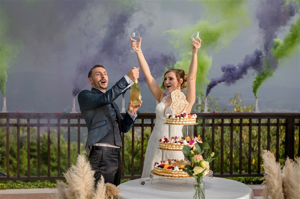 Il ricevimento, dopo l’antipasto e le portate al tavolo, è proseguito con un momento pirotecnico che ha fatto da cornice al taglio della torta.