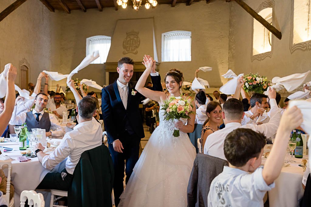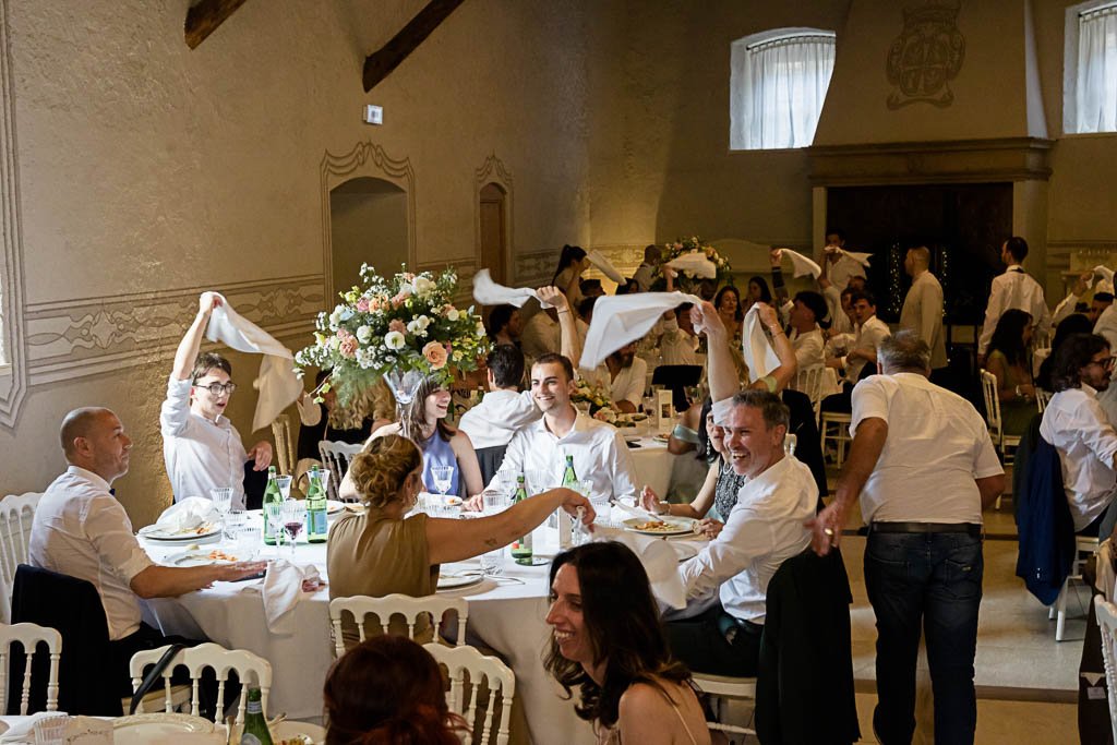 Al taglio della torta gli sposi sono stati lanciati in aria, hanno ballato e continuato i festeggiamenti sino a tarda sera.